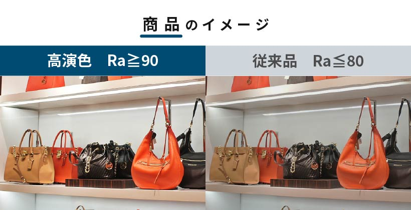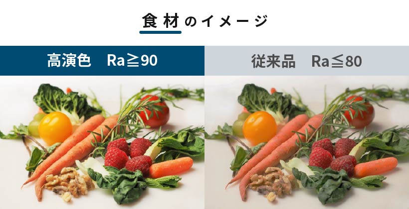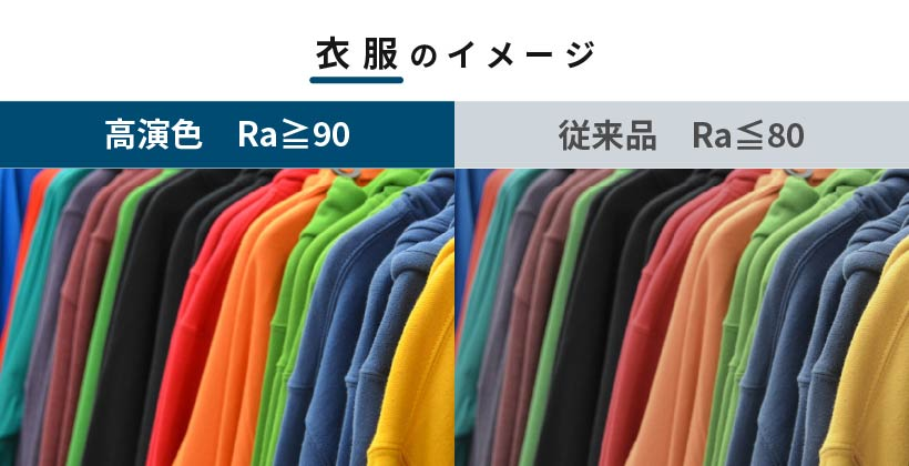 演色性はRa値の高さで示し、Raの"R"は演出(Rendition)、"a"はaverage(平均値)を表します。太陽の自然光で見える状態を一番良い状態とし、その基準をRa100としています。演色性が高いほど照らした製品はより鮮やかに見えるため、特に商業照明には高演色性LEDが使用されます。標準的なLEDはRa70〜90程度ですが、近年は上振れ数値であるRa90が標準となっています。