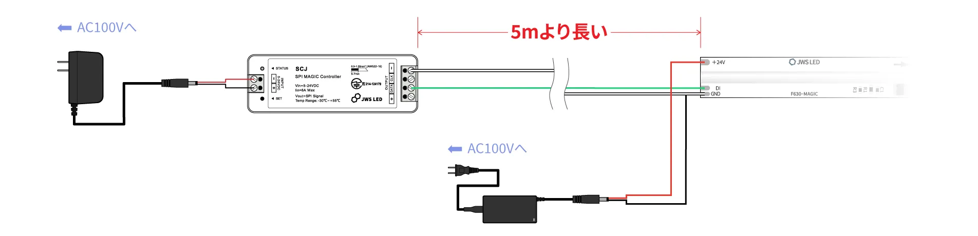 マジックコントローラーとマジックLEDテープ間の配線が5mより長い場合は、電源供給をコントローラー側からのみではなく、コントローラーとLEDテープで電源供給を別々にしてください(配線は下記参考)。