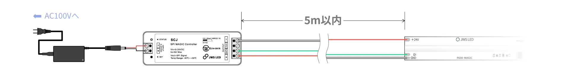 マジックコントローラーとテープ間の配線が5m以内の場合