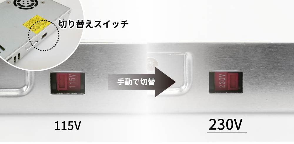 スイッチング電源の入力電圧を200Vで使用したい場合はどうすればいいですか?読了時間:約 1 分スイッチング電源の側面には入力電圧を切り替えるスイッチがあります。出荷時は115Vになっているので、マイナスドライバーなどで230Vに切り替えてください。144W、156W、211W348W、350W