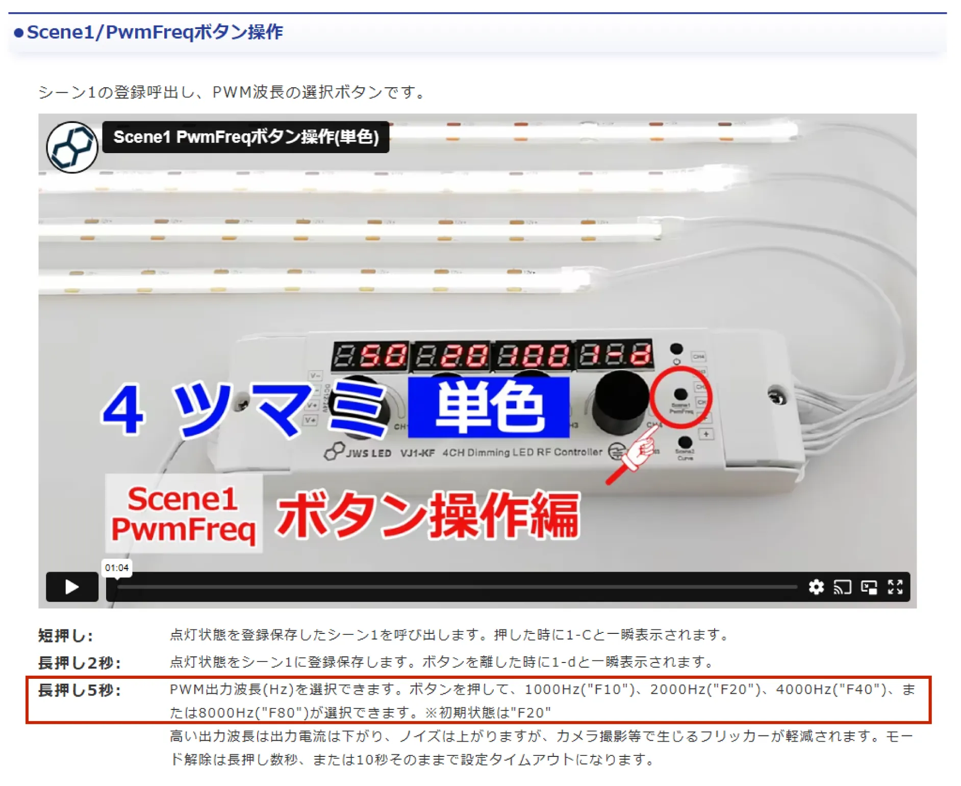 • 2.F20やF10などが表示されたら "Scene1/PwmFreq" ボタンを押してF80に変更 ※デフォルトF20(2000Hz)をF80(8000Hz)の波長に変更