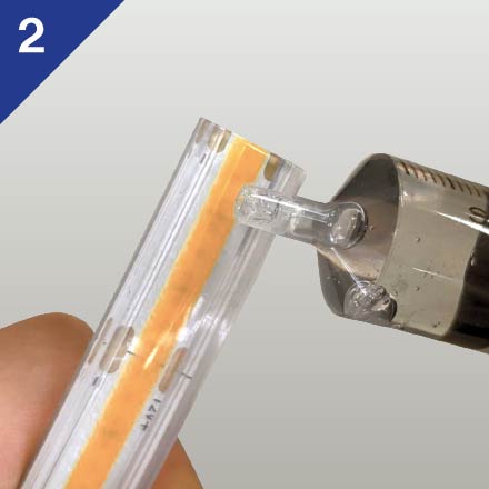 シリコンでLEDテープを覆った防水タイプはカット後に隙間を埋める接着剤を塗布し、エンドキャップを被せて下さい。