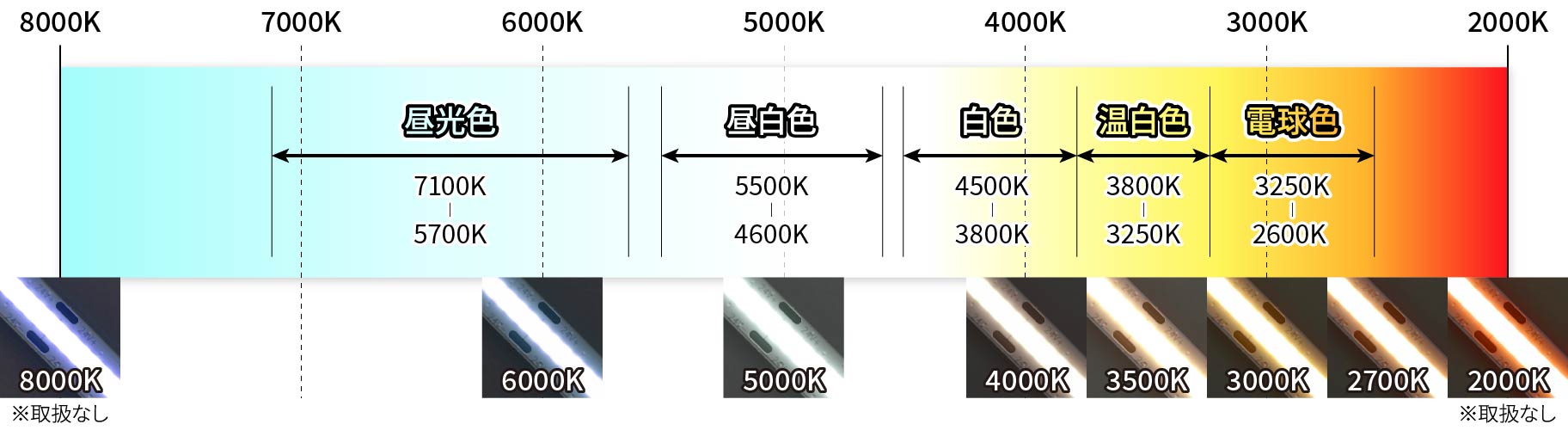単位はK(ケルビン)で表記され、JIS規格では昼光色が「5700K-7100K」、昼白色が「4600K-5500K」、白色が「3800K-4500K」、温白色が「3250K-3800K」、電球色が「2600K-3250K」の範囲で定義されています。