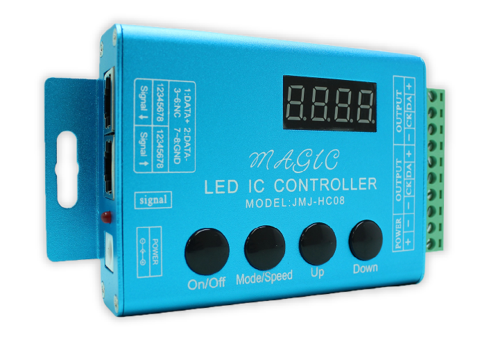 リモコンのボタン操作でカラー切り替えからシーン登録まで直感的に行えるマジックコントローラーです。厳選された点灯パターンはよく使われる40パターンを収録。点灯パターンも含めた全点灯で明るさ調整ができます。簡易モデルのため、直列数10mまでの使用に適しています。 | 本体ボタンで直接操作するマジックコントローラーです。最大制御IC数が最大2048個と多く、点灯信号はスペックの高いマイコンにより出力されています。長尺のテープライトでも比較的動作が安定するため、直列100mなど長いテープの点灯制御に適しています。 |