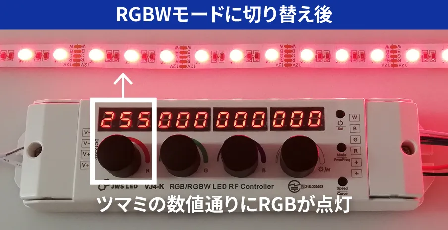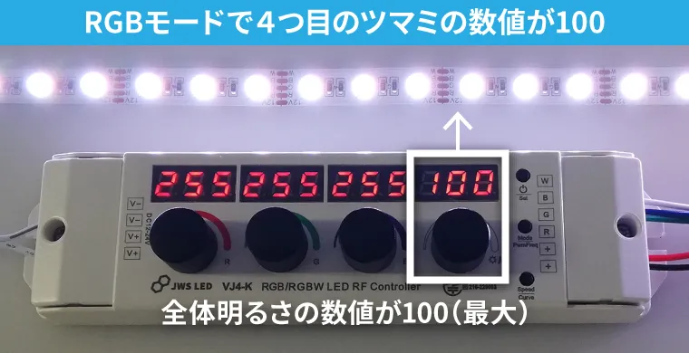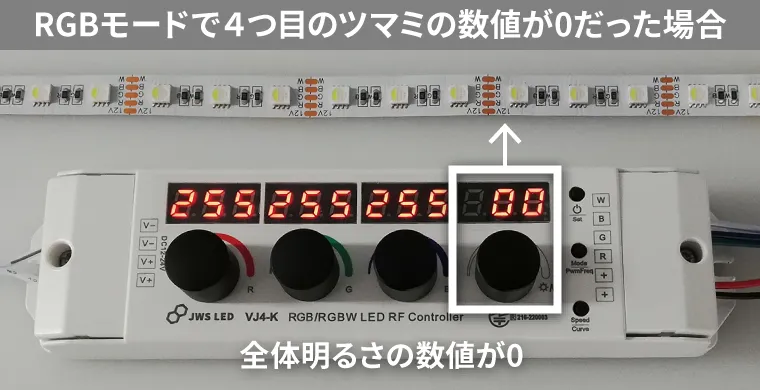 そのため、RGBモードで4つ目のツマミの数値が”0”の状態でRGBWモードに切り替えると、R、G、Bのツマミをいくら回しても一切点灯しなくなるため注意してください。