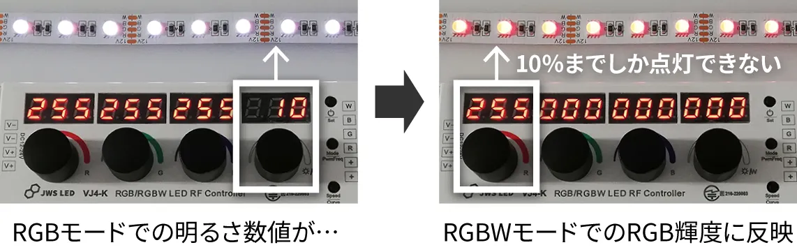 製品の仕様上、切替前のRGBモードで設定していた4つ目のツマミ(全体明るさ)のレベル値が、RGBWモードに切り替え後のR、G、Bのツマミの最大値となります。