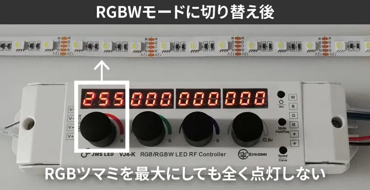 RGBモードからRGBWモードに切り替えて操作すると、R、G、Bのツマミを回しても点灯しません。