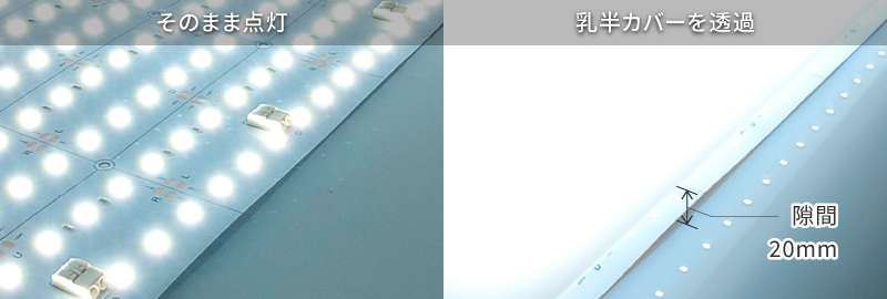 LEDシートライトの上に拡散カバーを設置する距離は、2cm〜5cmの範囲を推奨しています。ただし、実際の材料の厚みや透光度の違いによって異なるため、あくまで参考値となります。
