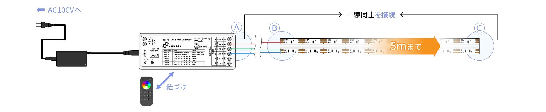 F630 RGB 12Vテープの入力側にRGBコントローラーを接続。テープの末端から+線のみをコントローラーの+線に接続。テープ末端のRGB線は電源に接続しないでください。