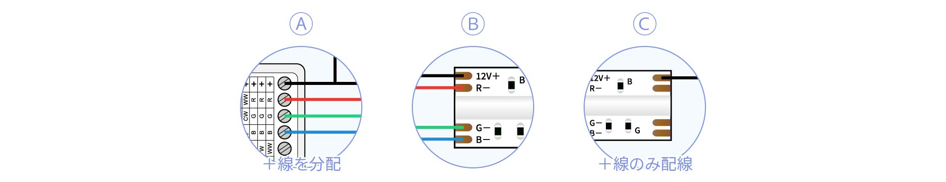 上記の方法で電圧降下を抑えて使用できます。また、12V製品で片側電源供給の場合はを3m以内の長さで使用するのがおすすめです。