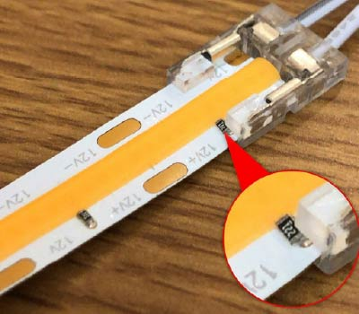 LEDラインテープF504シリーズ 12Vをラインテープコネクタに差し込むと、基板上の抵抗に接触してしまい、テープの不点灯を引き起こします。